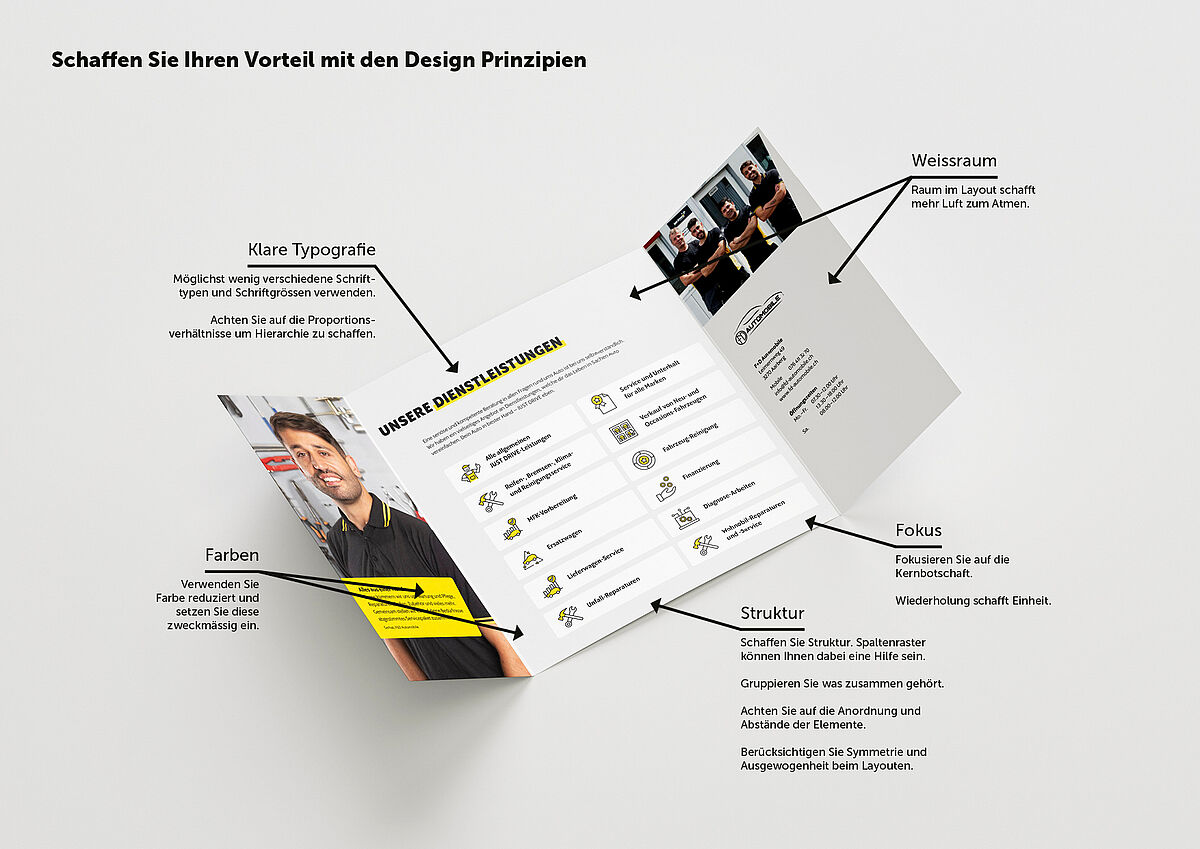 Weissraum schafft Luft zum Atmen und lenkt die Aufmerksamkeit auf das Wesentliche. überladen Sie das Design mit vielen Elementen, lassen Sie bewusst Raum zwischen Texten und Bildern. Dadurch wirkt es leichter und übersichtlicher.