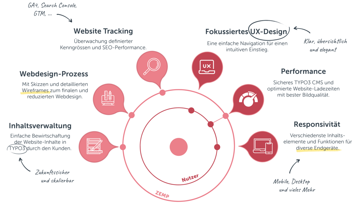 Intensive Meetings, eine umfassende Analyse der aktuellen Website und Keywords und ein mehrstufiger UX/UI-Prozess haben die Grundsteine für eine erfolgreiche Umsetzung der neuen und modernen Plattform für die Zemp AG gelegt.