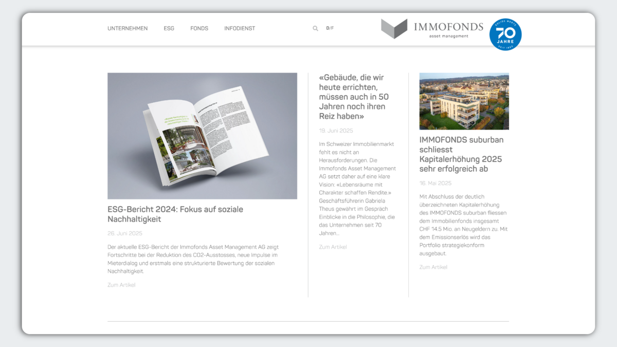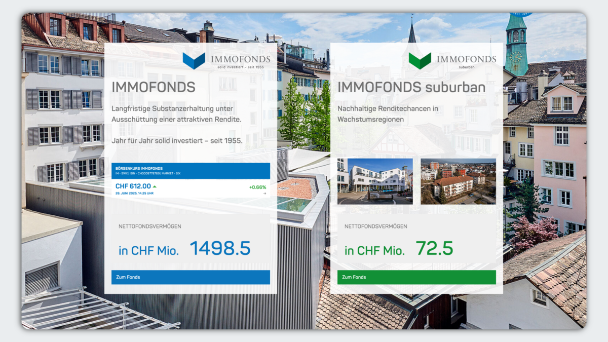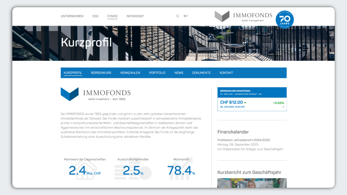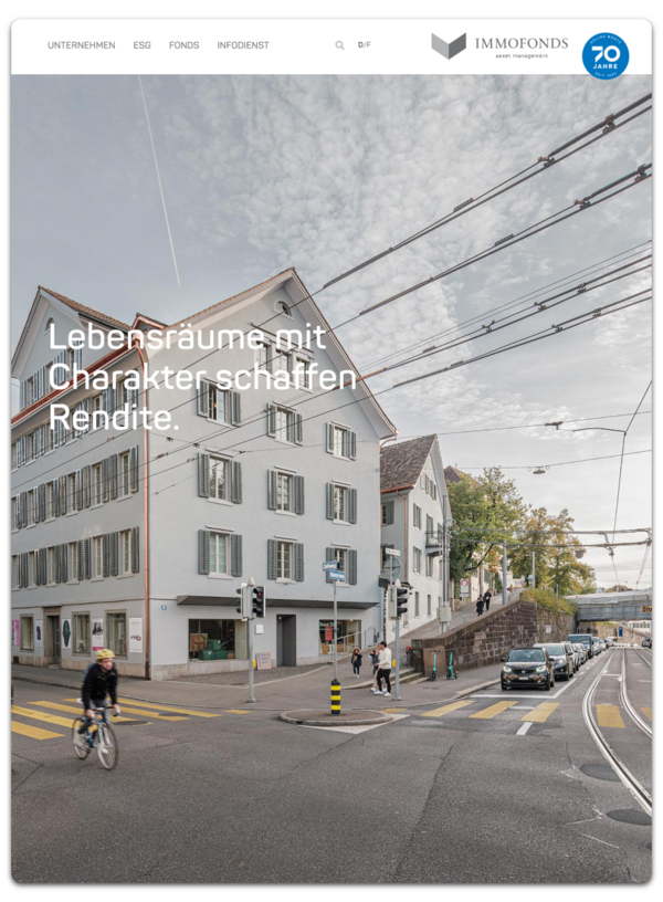 Für die Vermarktung ihrer Dienstleistungen ist die Website für Immofonds von grosser Bedeutung. Um den sich laufend verändernden Bedürfnissen der Zielgruppen weiterhin gerecht zu werden, haben wir eine moderne, ansprechende TYPO3-Plattform in den Sprachen Deutsch und Französisch umgesetzt. Im Kern soll die neue Plattform Kompetenz vermitteln, ein neues Produkt integrieren, den Besuchern mit relevanten Inhalten einen Mehrwert bieten und flexibel erweiterbar sein.