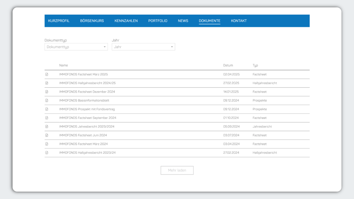 Jedes Investmentprodukt, wie auch die Startseite, verfügt über einen eigenen Downloadbereich. Einzelne Dokumente können dabei einfach und übersichtlich via Filter gesucht und sortiert werden – verschiedene Kriterien und Ebenen liefern hier die nötige Funktionalität.