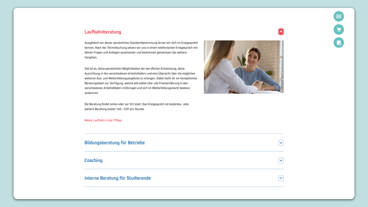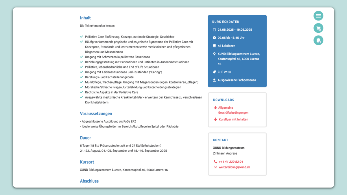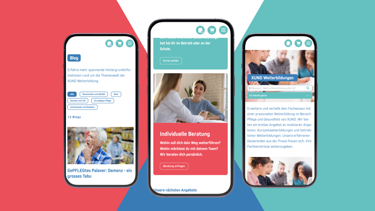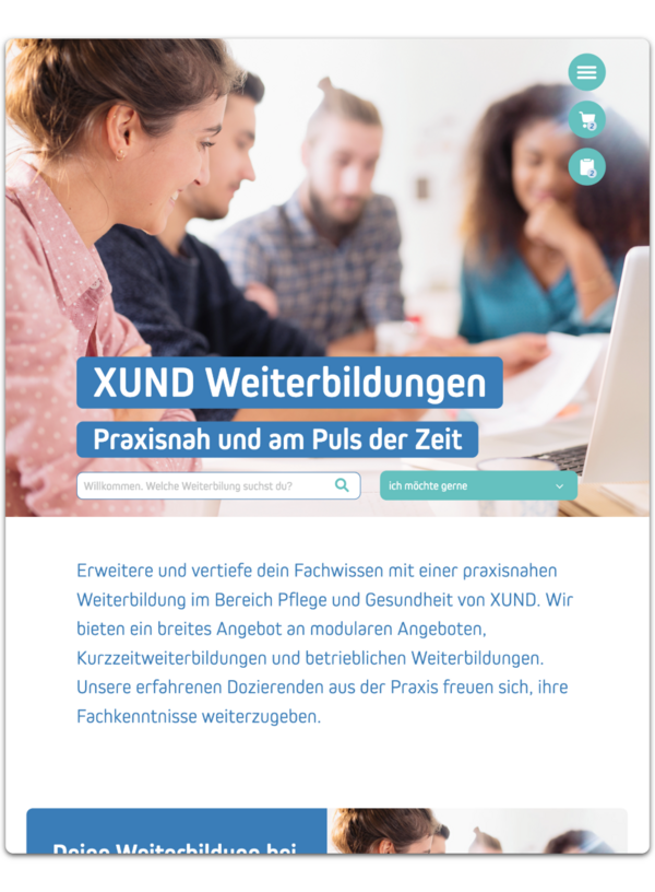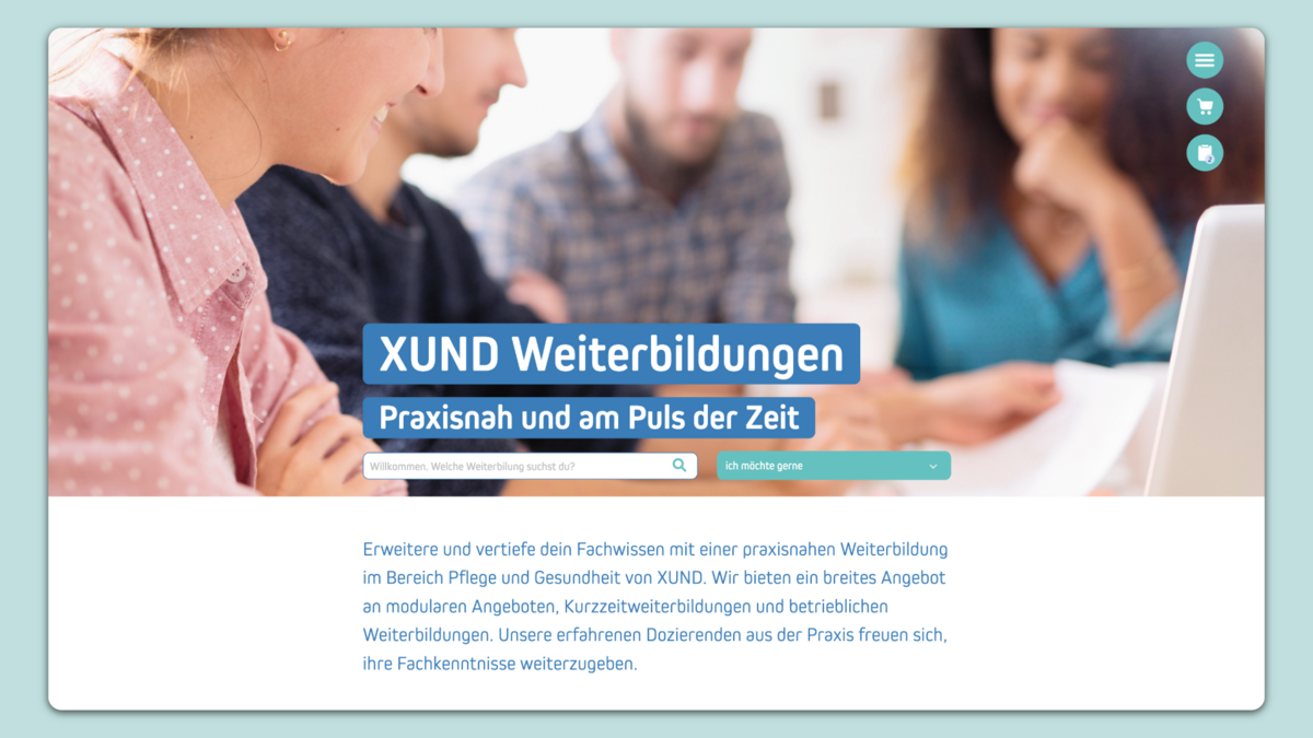 XUND bietet eine grosse und breite Auswahl an Aus- und Weiterbildungen im Gesundheitsbereich an. Der Bereich «Weiterbildung» war bisher auf der XUND- Website nicht ganz einfach auffindbar, war statisch, wenig emotional und die User Experience bei der Anmeldung für mehrere Kurse oder Kursmodule nicht besonders befriedigend.