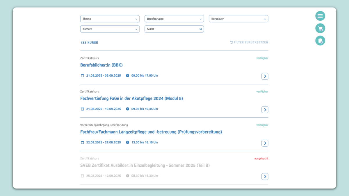 Zur Erreichung der festgelegten Ziele und Anforderungen, entwickelten wir eine Vergleichsfunktion, in welcher die Benutzer Kurse und Module einander gegenüberstellen können, um das passende Kursmodul oder den optimalen Kurs rasch und einfach zu finden. Ein «Warenkorb» hilft, dass der Kunde neu nur einmal seine Adresse, bzw. seine Koordinaten angeben muss, auch wenn er mehrere Kurse oder Kursmodule auswählt – dies war zuvor nicht der Fall gewesen.