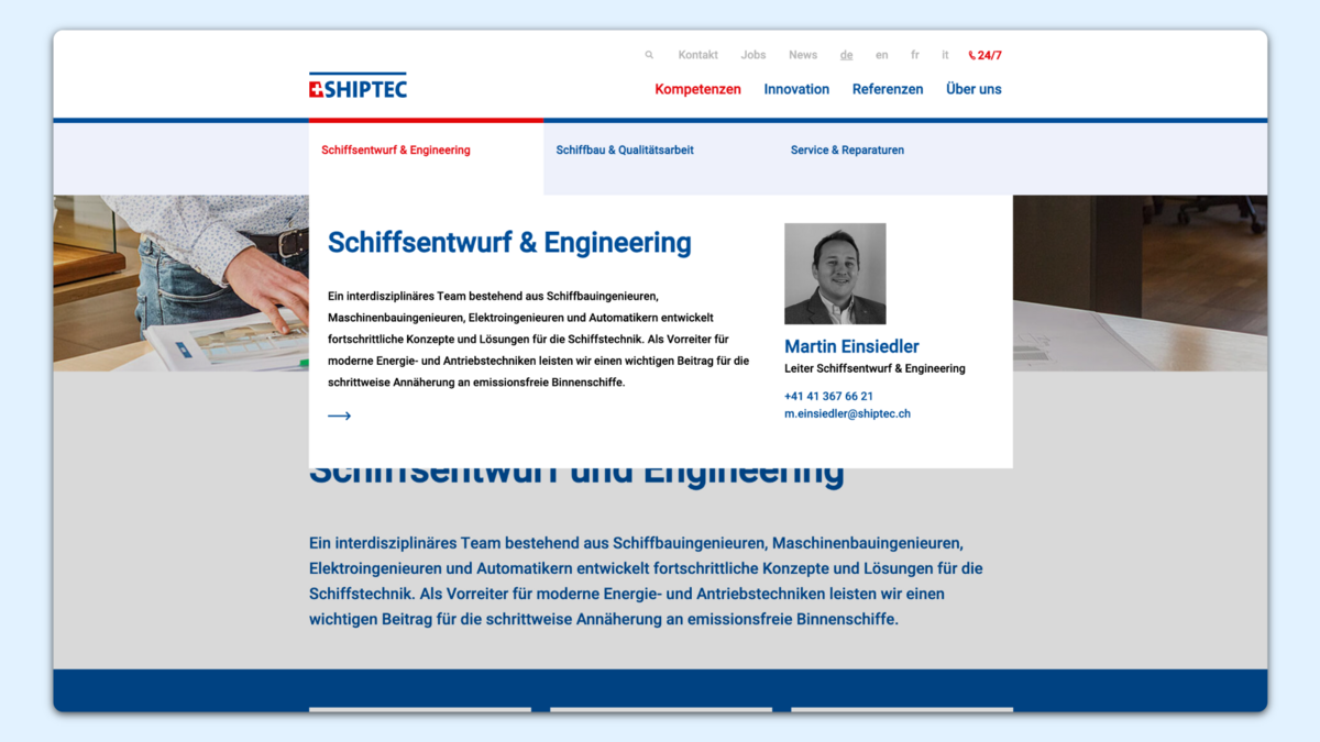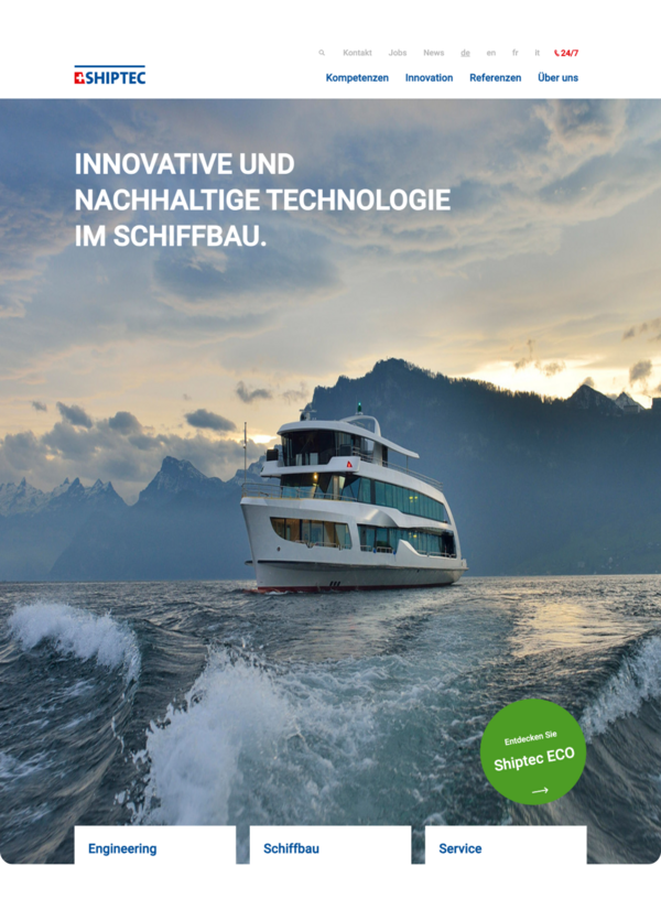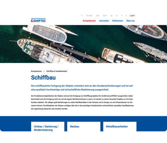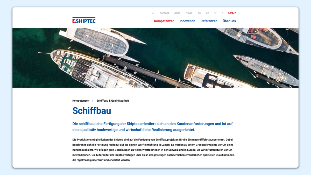 Die Shiptec AG will sowohl in der Schweiz als auch in den umliegenden geografischen Märkten als führendes Unternehmen für Schiffstechnik in der Binnenschifffahrt wahrgenommen werden. Die Corporate Website soll dabei insbesondere als digitale Visitenkarte für den Brand und die Reputation agieren. Um den Anforderungen gerecht zu werden haben wir eine moderne TYPO3-Website erarbeitet, mit der sich das Unternehmen bei ihren diversen Zielmärkten und Zielgruppen positionieren und einen kompetenten Eindruck vermitteln kann.