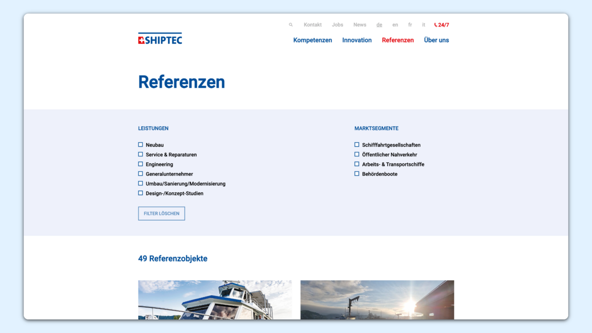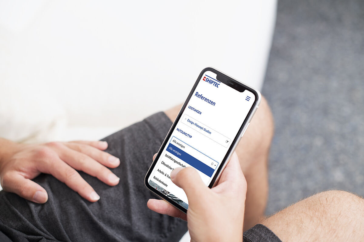 Für die Präsentation der Referenzobjekte wurde ein eigens für Shiptec programmiertes Modul eingesetzt. Für potenzielle Kunden bietet es eine einfache Übersicht, die sich nach verschiedenen Kriterien filtern lässt. Die einzelnen Referenzen enthalten umfangreiche Informationen wie technische Daten, eingebundene Videos bzw. Fotos sowie eine direkte Kontaktperson. Damit die Inhalte von jedem Endgerät einwandfrei dargestellt werden, wurde die gesamte Website – natürlich – responsive designt.