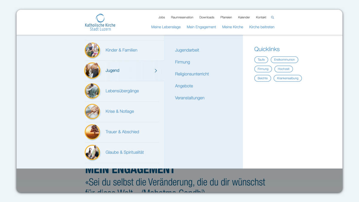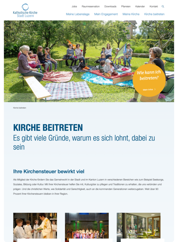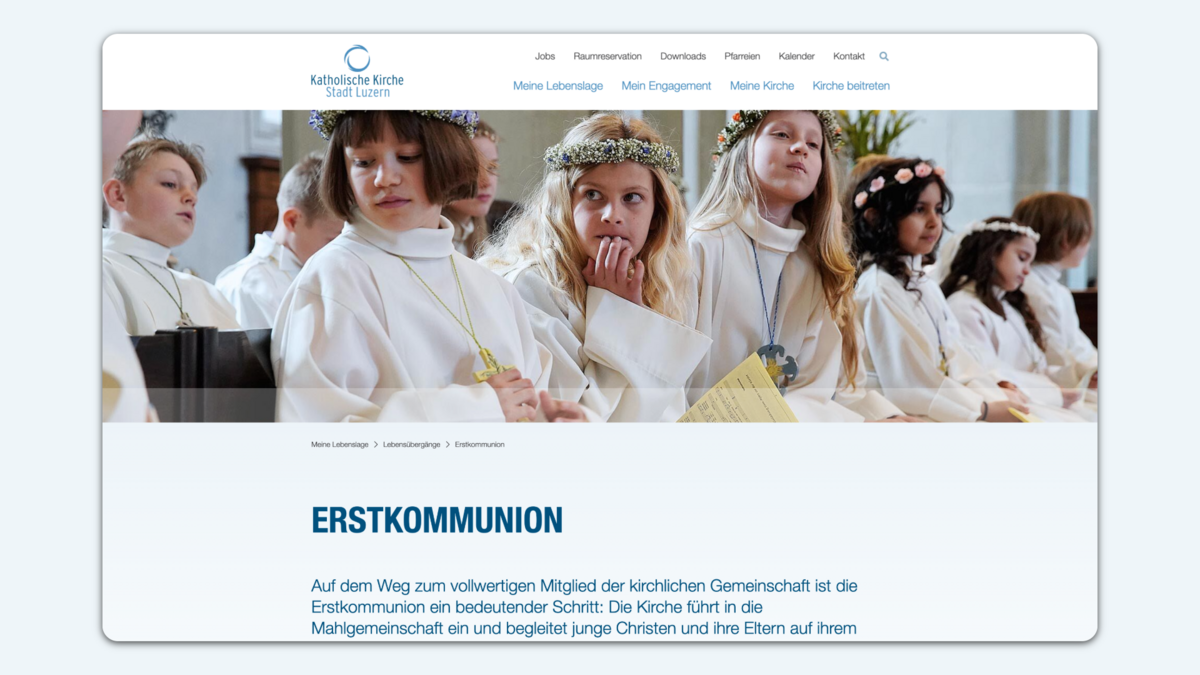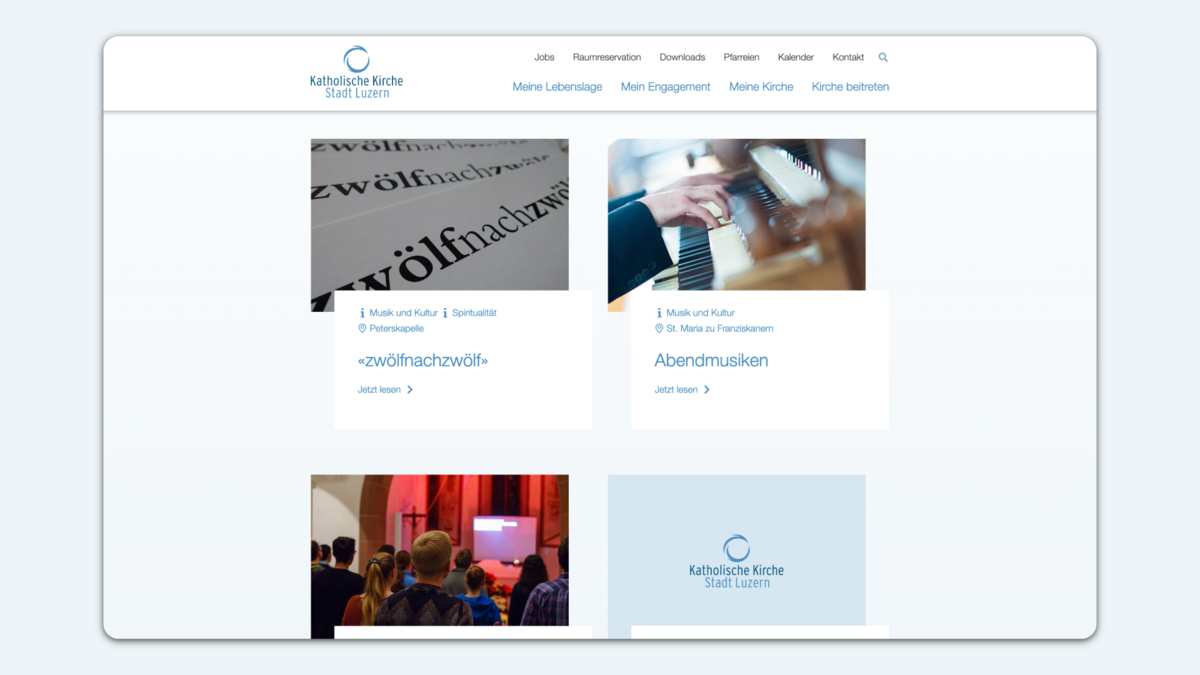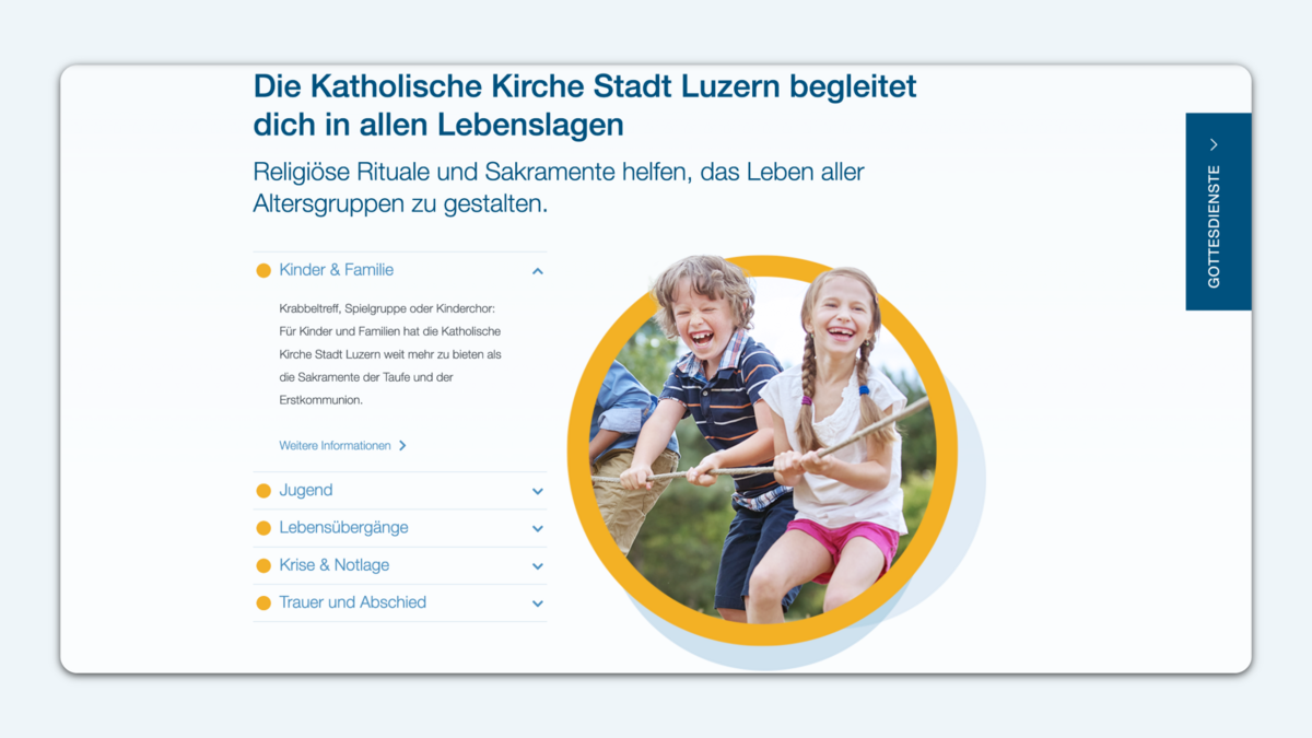 In verschiedenen Workshops haben wir gemeinsam mit der Steuergruppe die Informationsbedürfnisse der unterschiedlichen Anspruchgruppen der katholischen Kirche Stadt Luzern erarbeitet, Prozesse hinterfragt und ein umfassendes Verständnis geschaffen. So haben wir auf der einen Seite die interne Sichtweise der Kirche und durch uns als Agentur die notwendige Portion Aussensicht ins Projekt miteingebracht. Daraus leiteten wir gezielte Fokuspunkte für die Websitearchitektur und die Inhalte ab. So wurden beispielsweise nebst einer Meta-Navigation verschiedene Landingpages erarbeitet, die den Nutzern als Einstiegsportal via Suchmaschinen dienen – stets wurde eine maximal zielgruppenorientierte Umsetzung und Herangehensweise durchgezogen.