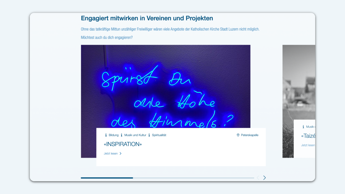 Die neue Website überzeugt durch die zielgruppenfokussierte Umsetzung. Durch die vielen Möglichkeiten des TYPO3 CMS verfügt die katholische Kirche Luzern nun über eine zeitgemässe und moderne Plattform. Auch nach dem Go-Live der neuen Website wird die erfolgreiche und proaktive Zusammenarbeit fortgeführt. Einerseits, um iterative Optimierungen an der Website vorzunehmen, andererseits, um unterstützende Off-/Online-Kommunikationsmassnahmen zu realisieren.